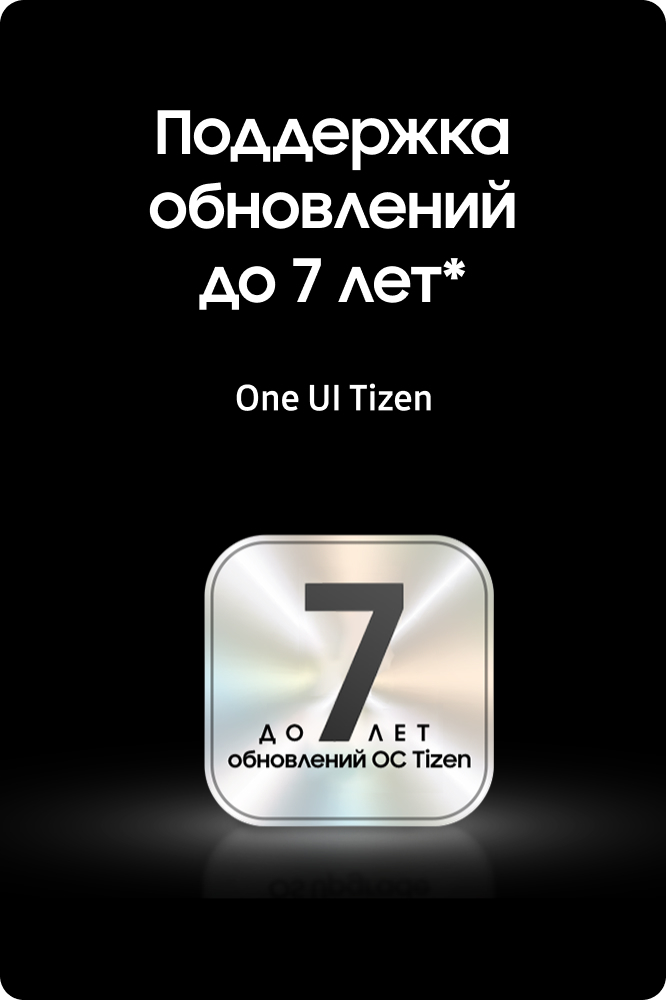 *Доступность контента и сервисов зависят от региона и это может меняться без предварительного уведомления пользователей. Перед использованием нужно принять Положения и условия сервиса Smart Hub, а также Политику конфиденциальности. Некоторые материалы и сервисы требуют регистрации и подписки.Требуется учетная запис Samsung.Обновление ОС Tizen будет поддерживаться до 7 лет, начиная с 2025 года для продуктов, выпущенных в 2025 году. Следует заметить, что обновление не распространяется на рабочие характеристики телевизора, функции или долговечность.