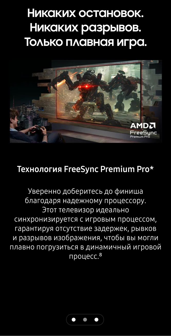 *Доступность контента и сервисов зависят от региона и это может меняться без предварительного уведомления пользователей. Перед использованием нужно принять Положения и условия сервиса Smart Hub, а также Политику конфиденциальности. Некоторые материалы и сервисы требуют регистрации и подписки.Требуется учетная запис Samsung.Обновление ОС Tizen будет поддерживаться до 7 лет, начиная с 2025 года для продуктов, выпущенных в 2025 году. Следует заметить, что обновление не распространяется на рабочие характеристики телевизора, функции или долговечность.